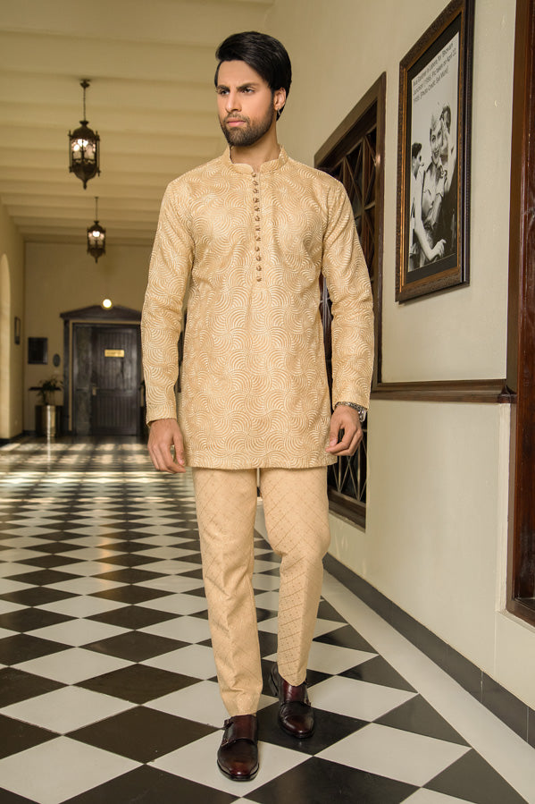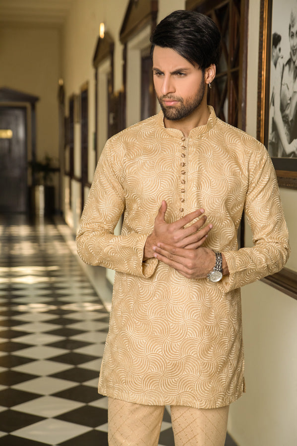 Kurta with an Elegant hue of golden, adorned with self-embroidery and golden button placket with loops, paired with same color plain pants to complete the look.