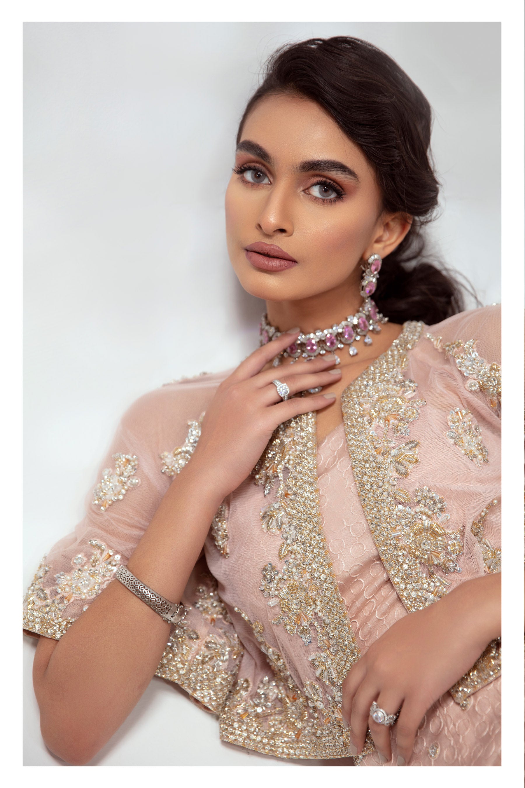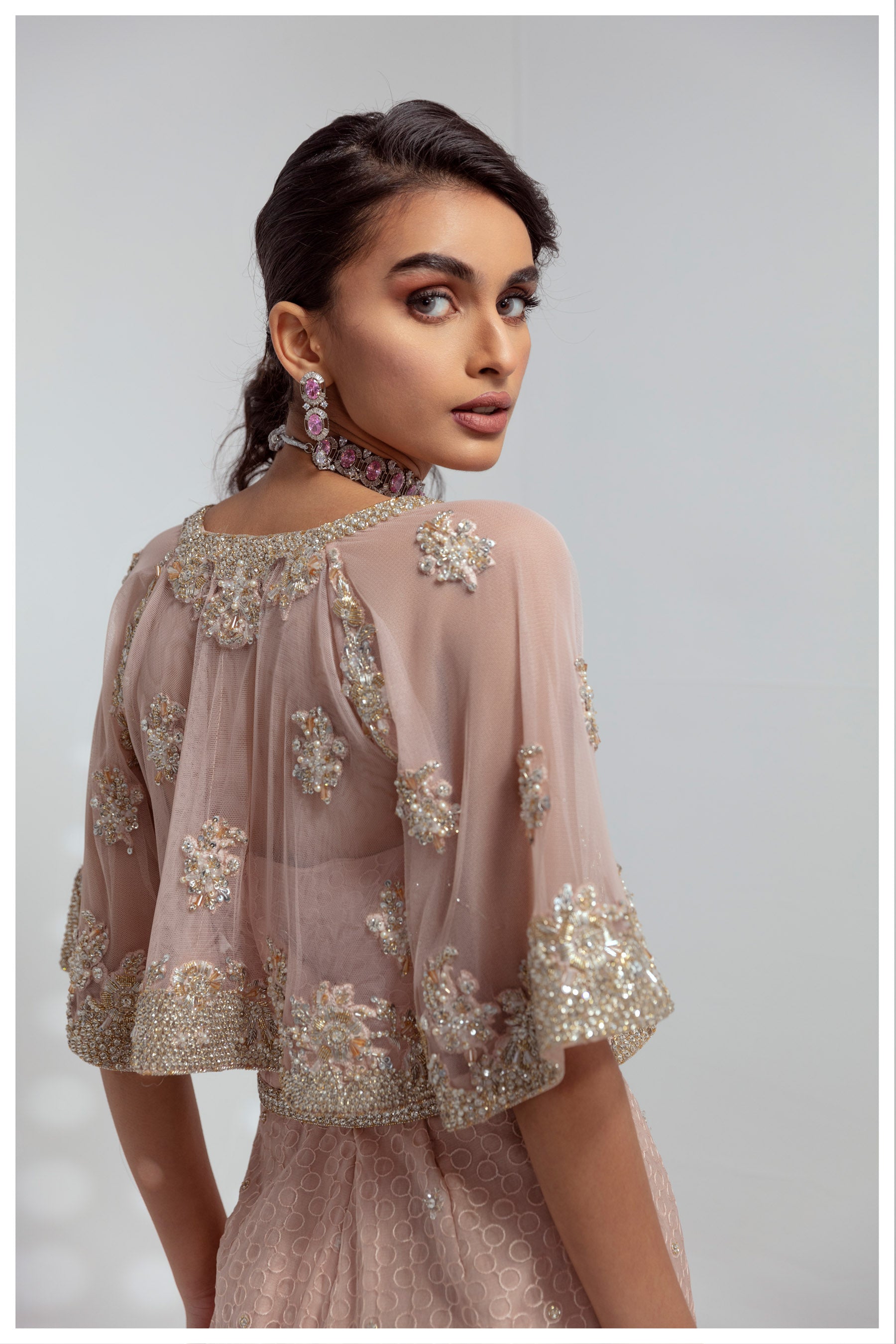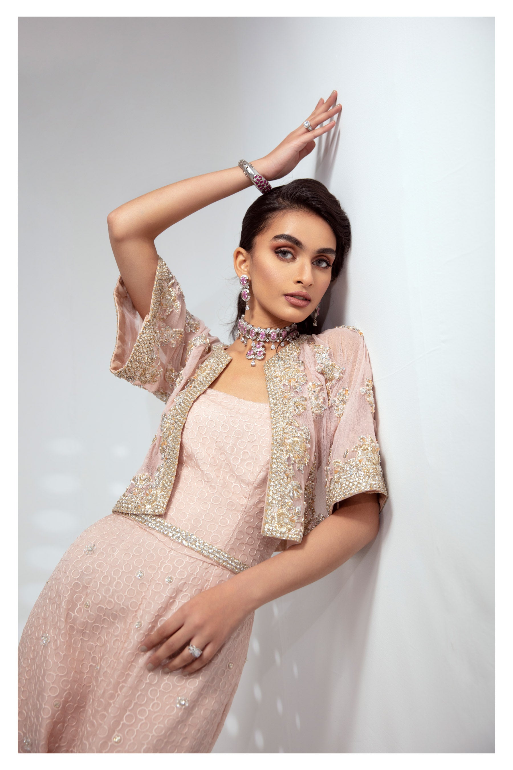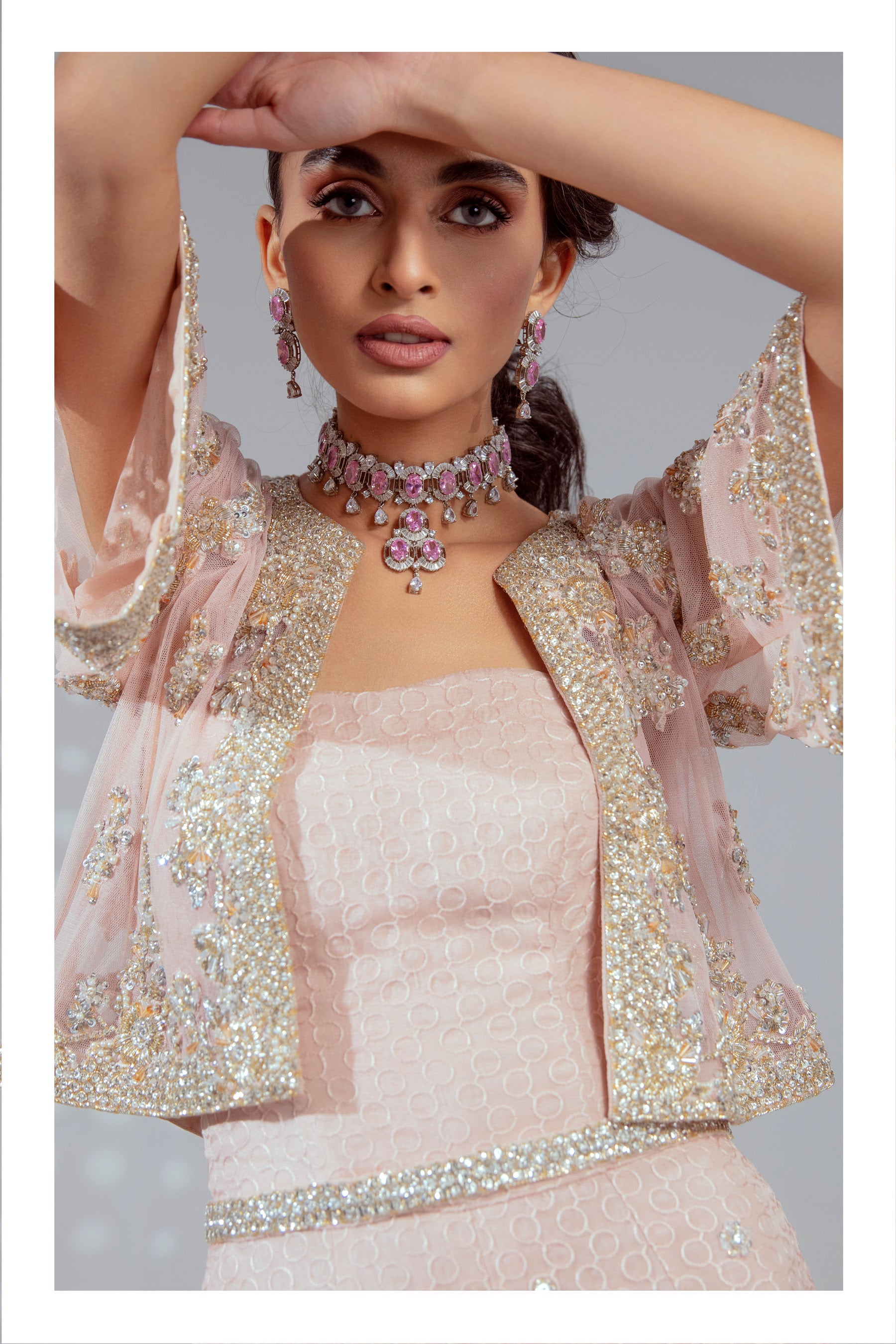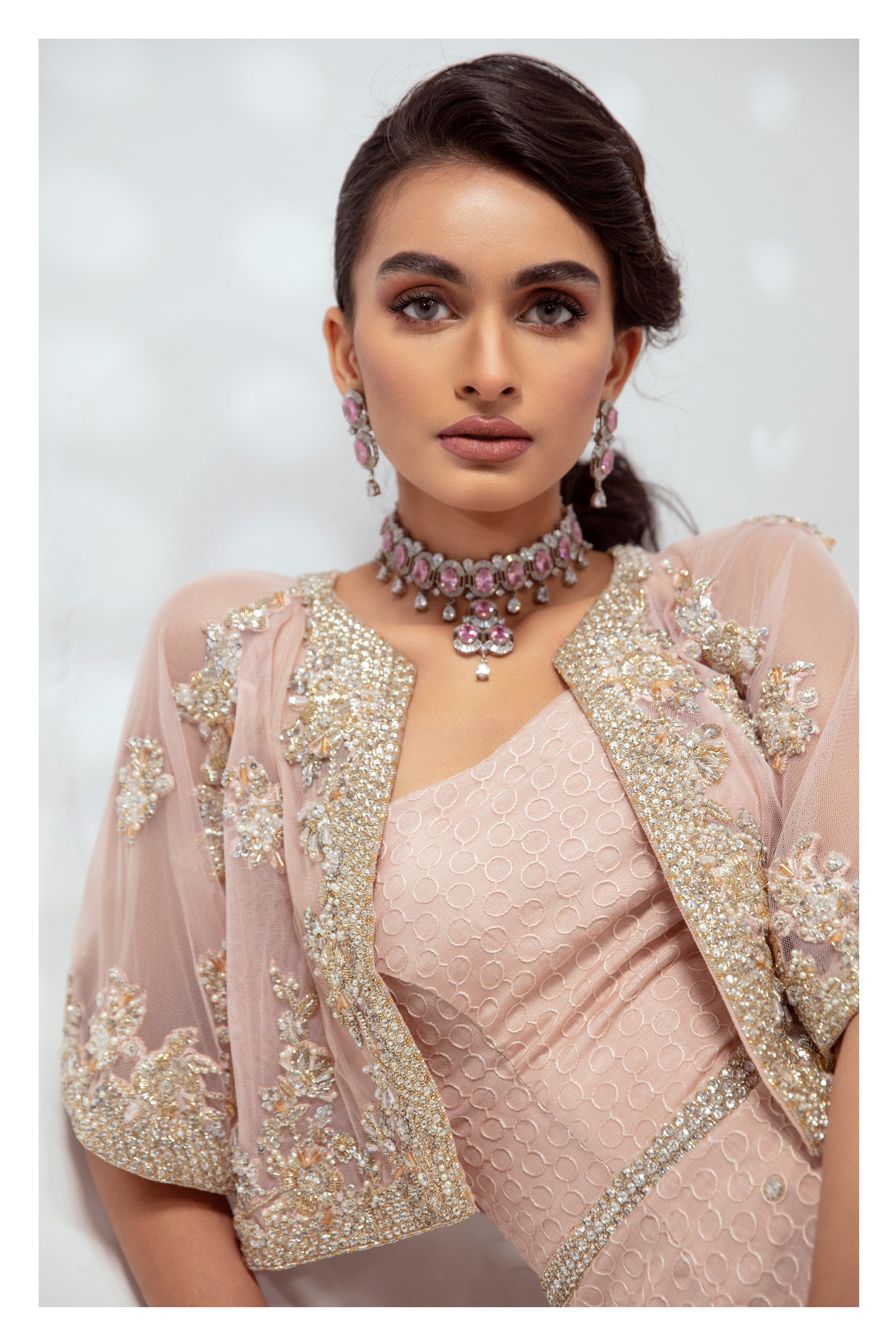 This Ready Couture master piece a short Body Cape Jacket in Pink Color Embellished using crystals dabka sand semi-precious stones gives a perfect selection for your Ready to wear priority.