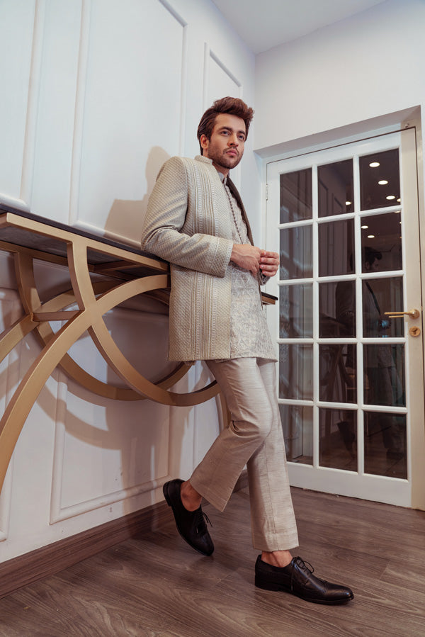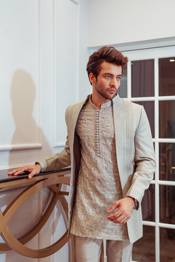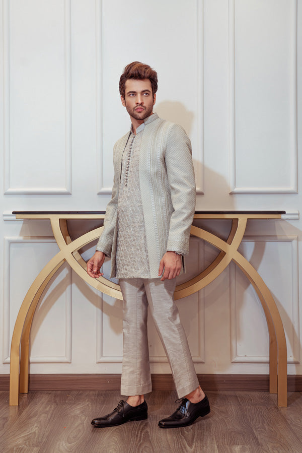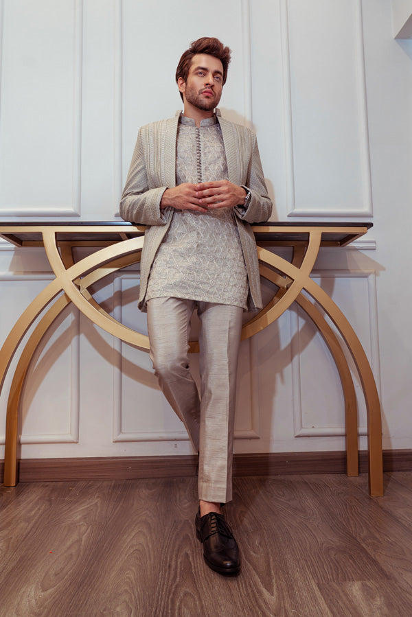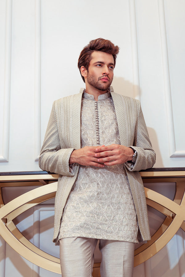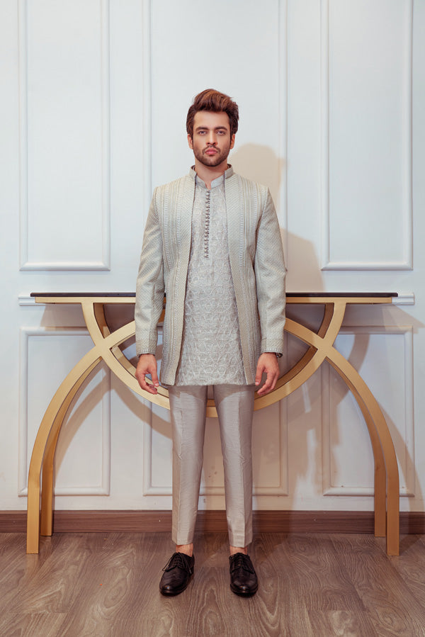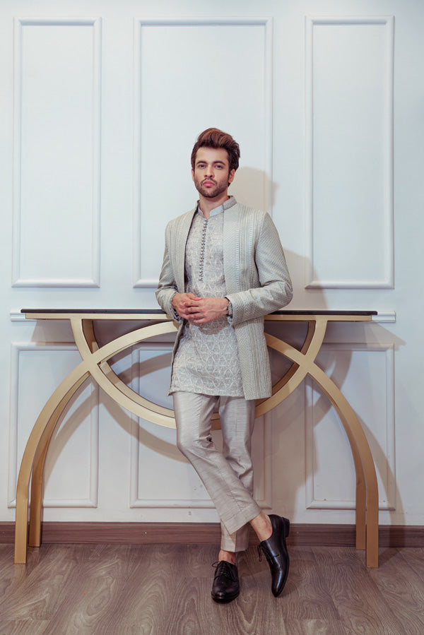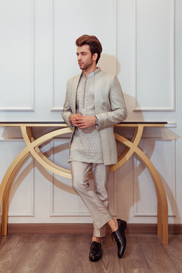 Steel Grey Open Cut Jacket with Signature Umar Khan Kurta and Pants (Jacket Plain Kurta and Pants Included 3 Pcs).