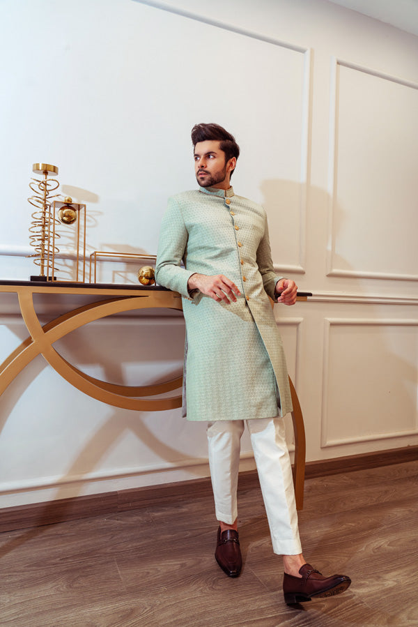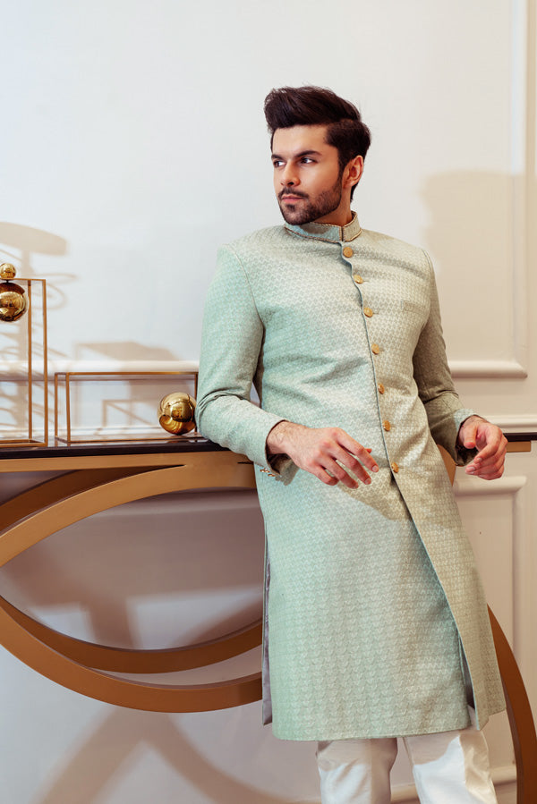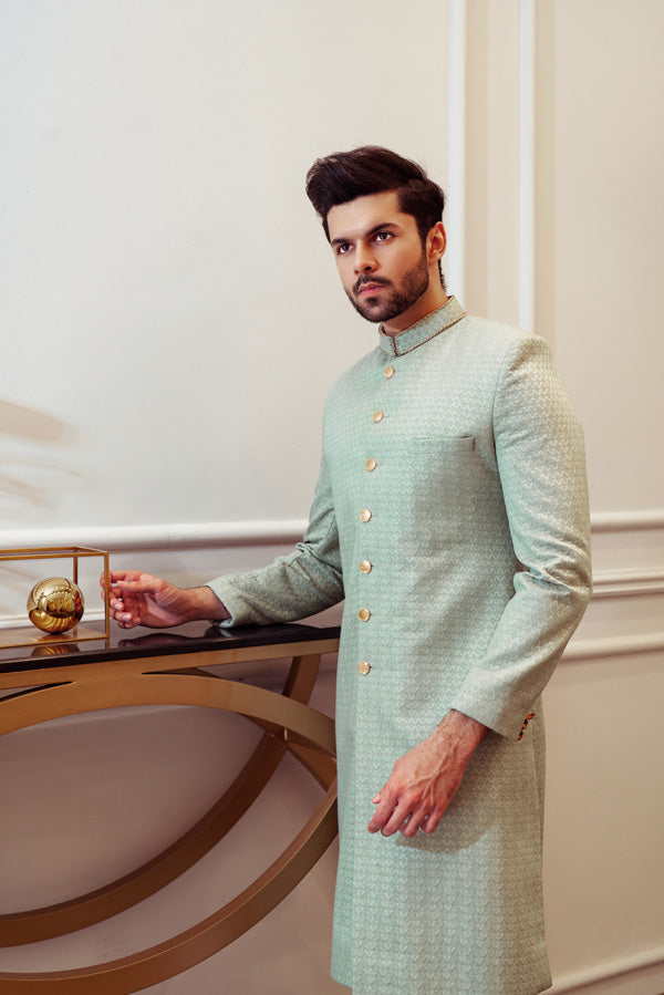 Exclusive luxury fabric in Pistachio Green color with embellishment on ban paired with Kurta and Pants type Pajama).