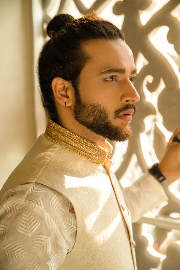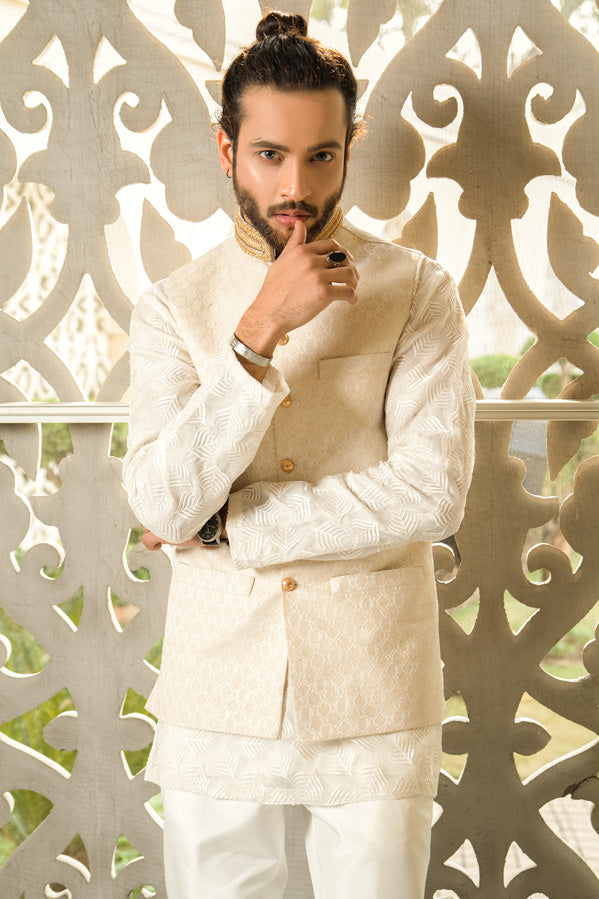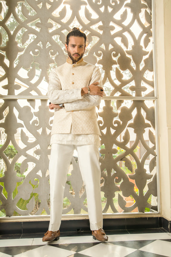 Signature UMAR KHAN Menswear fabric adds a spectacular Men Waistcoat with loop buttons kurta paired with plain formal pants. (Waistcoat Plain Kurta and Pants Included 3 PCs).