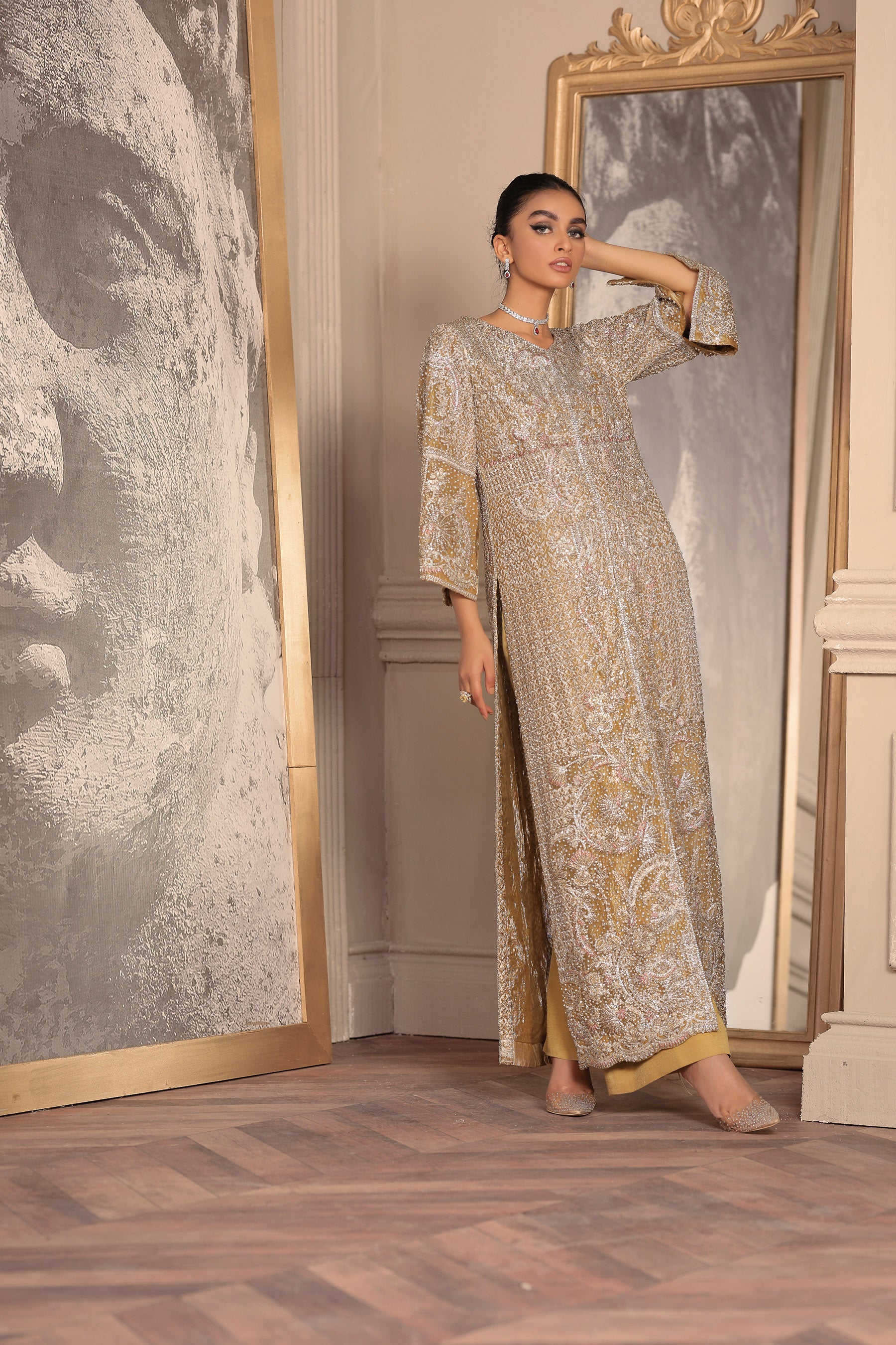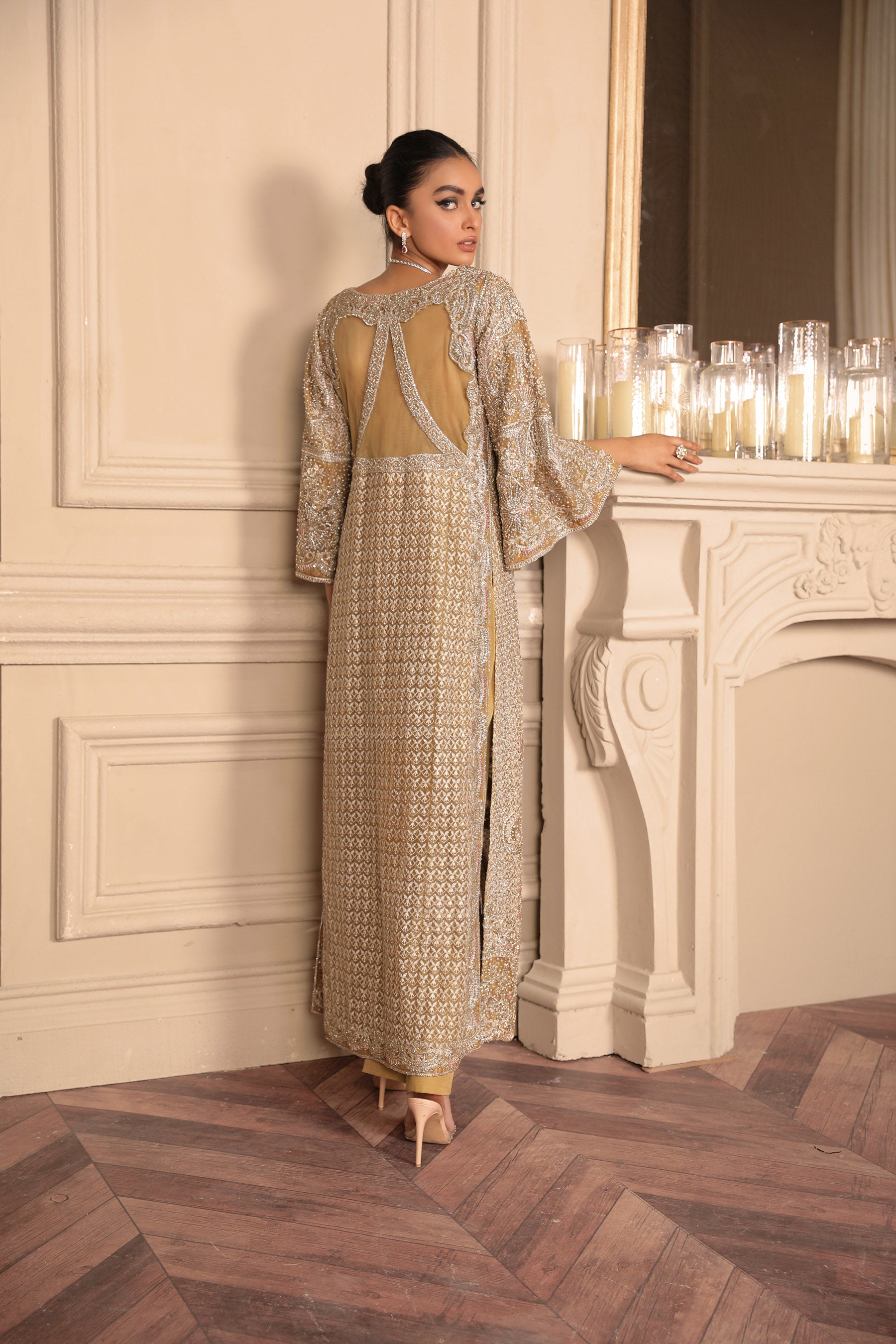 An elegant Full-length front slit open jacket in hue of olive green, delicately Embellishment with pearls, crystals, sequins dabka and semi-precious stones, designed with sleeves with slit inside.