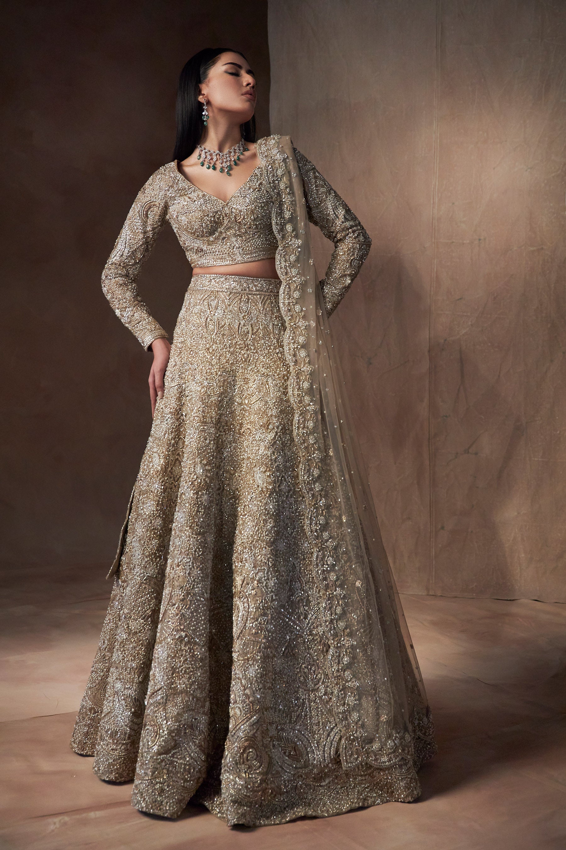 Introducing UMAR KHAN Couture Lavena Bridal: This exquisite Bridal Lehnga Choli outfit is designed using various unique techniques, incorporating Zardozi Crystals, Uncut semi-precious stones, Sequins, and Pearls in shades of Olive Green with Pearls and Resham Work. The meticulous Embellishment detailing and intricate thread work, combined with gems, create a dazzling ensemble unparalleled anywhere else. (Blouse Lehnga 3 Yard Net Dupatta Included 3 Pcs).