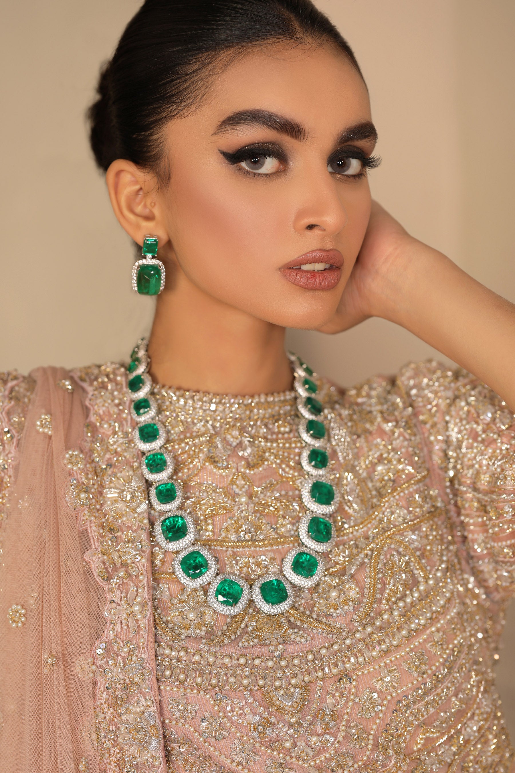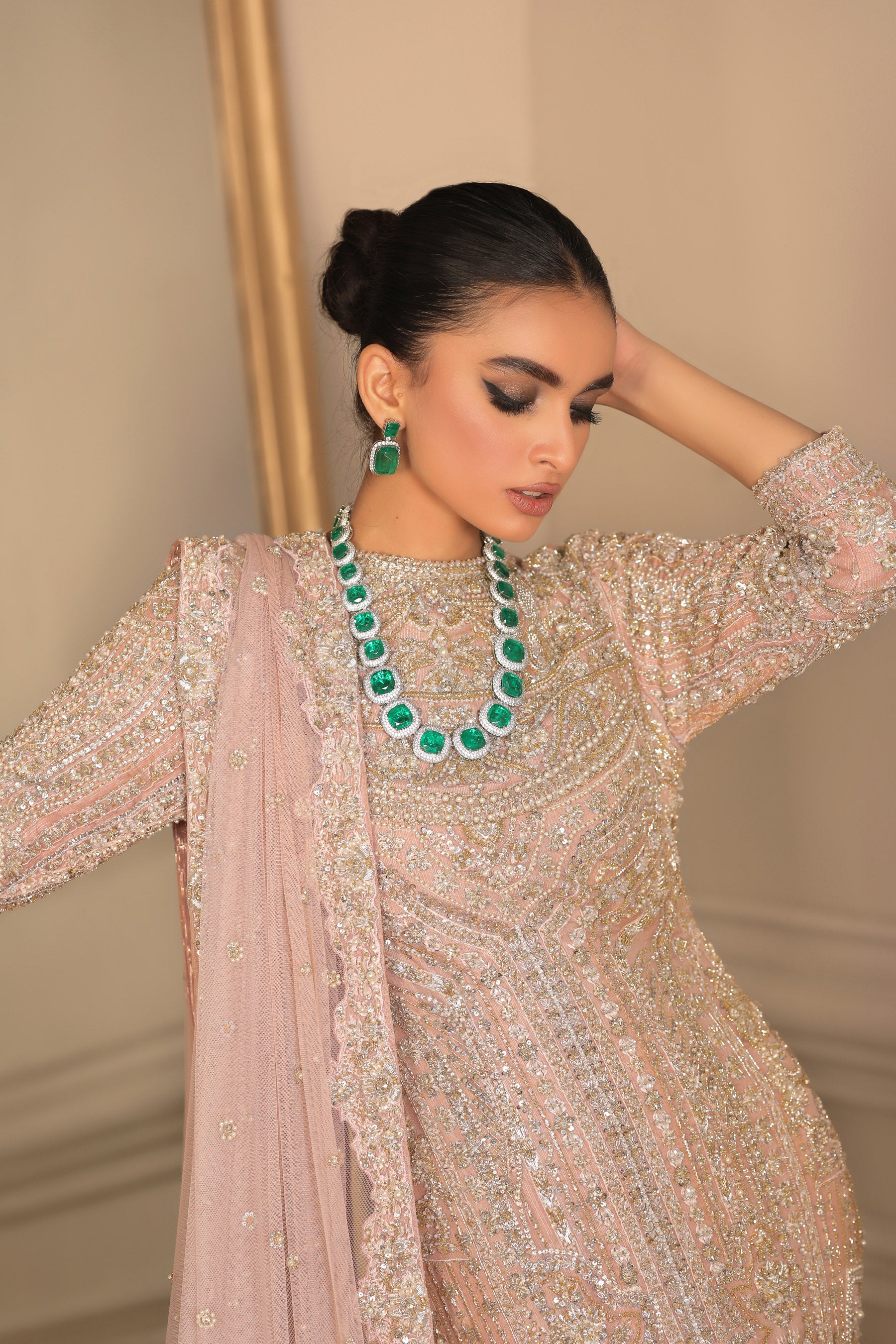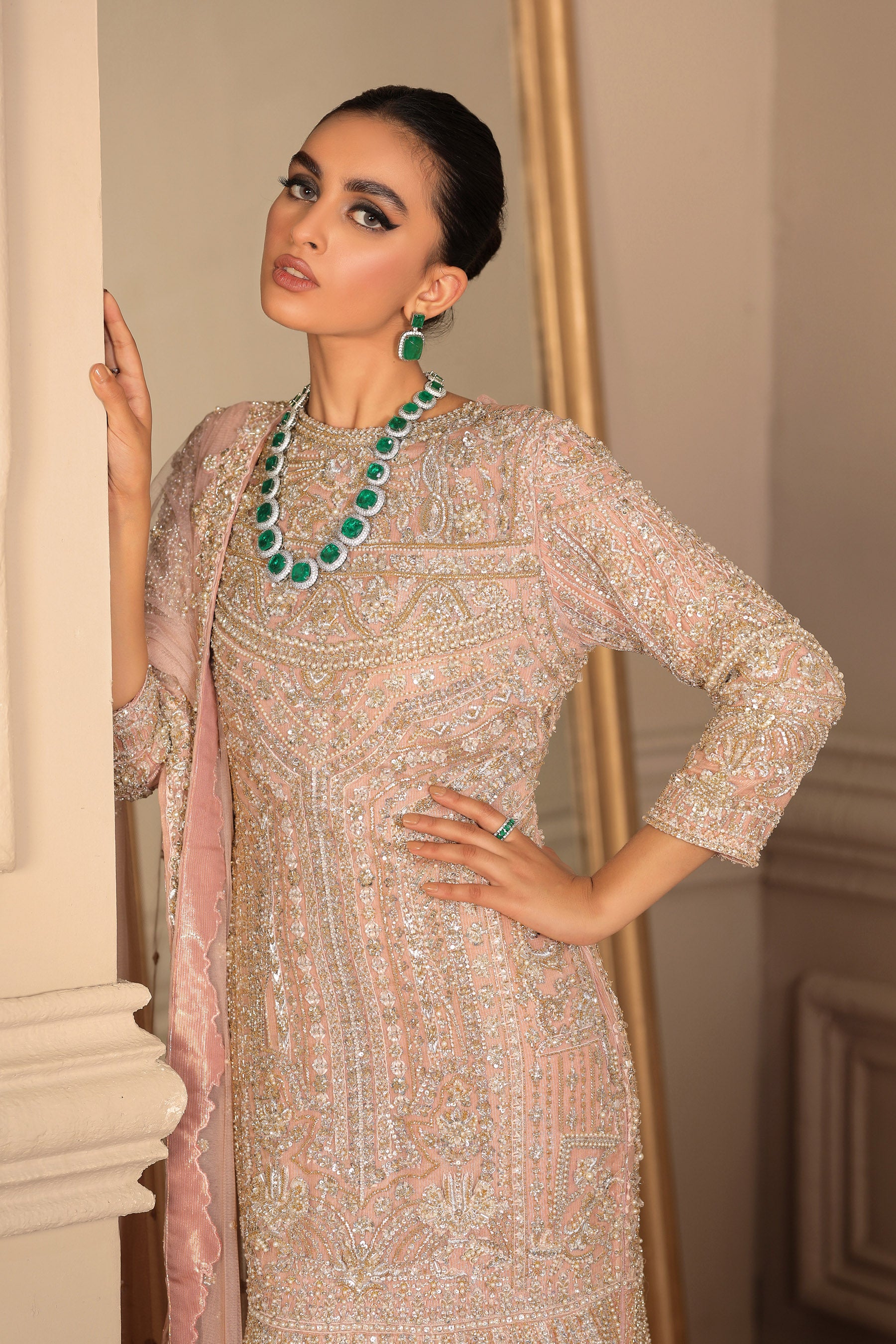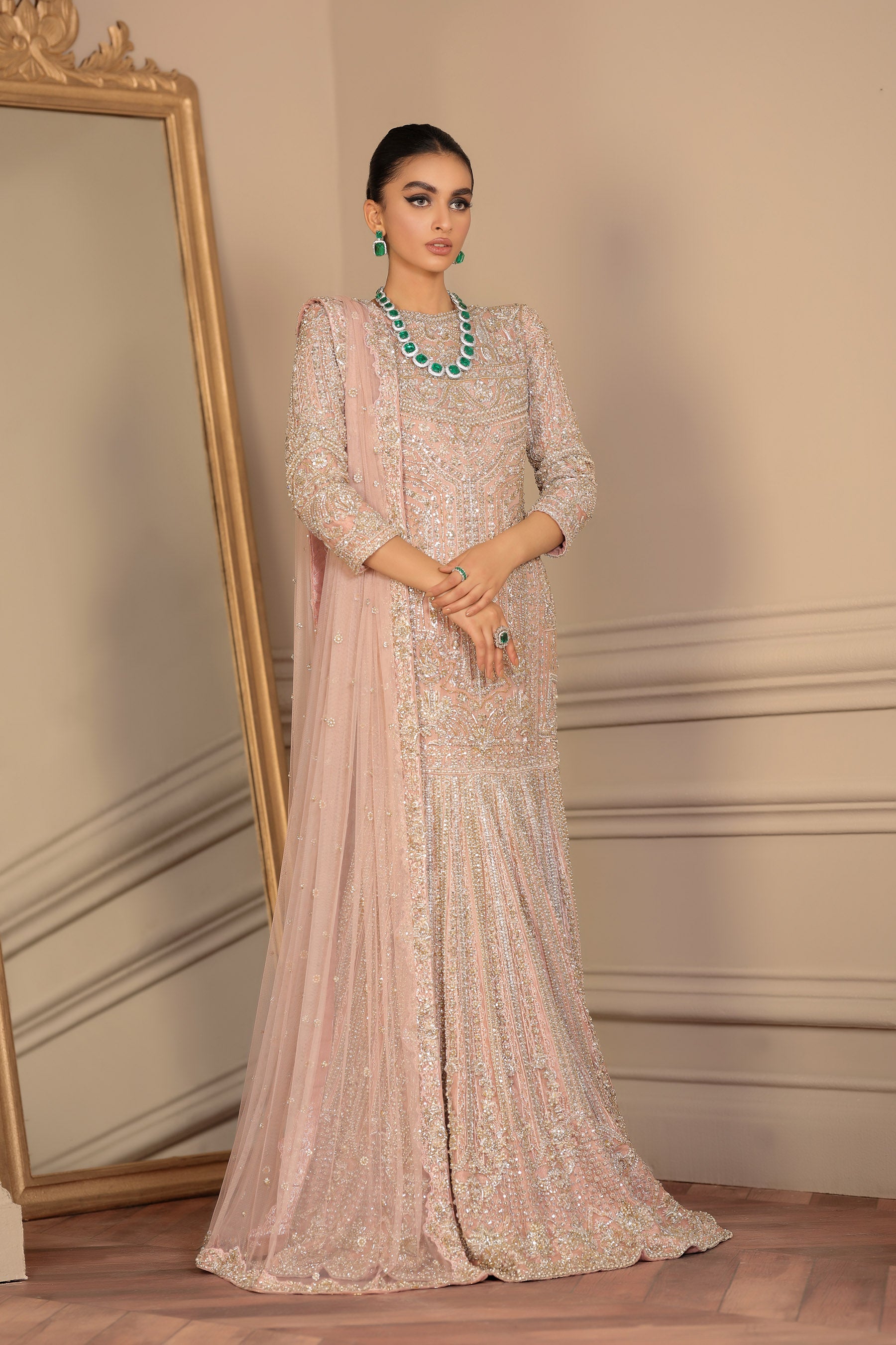 A Bridal with a magnificent style, with an essence of classy Blush Pink, Embellishment with detail using Pearls Dabka Sequins beads and semi-precious stones enhancing the look with a beautiful Net dupatta. (Bridal Outfit Goddey Panel with Net Dupatta Included).