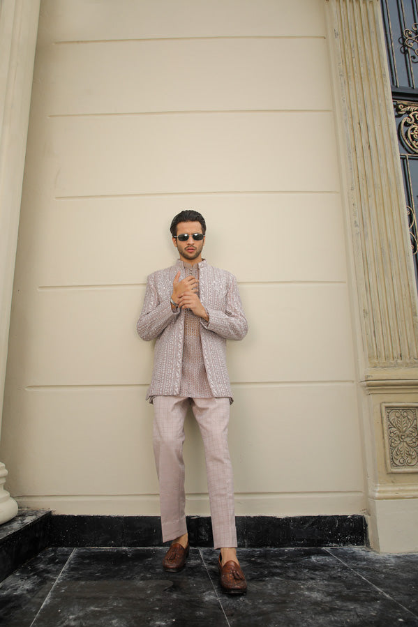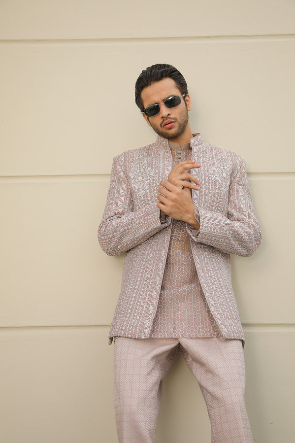 Uniquely designed UMAR KHAN Menswear Couture Jacket, in distinct shade. Paired with Kurta and Pants.