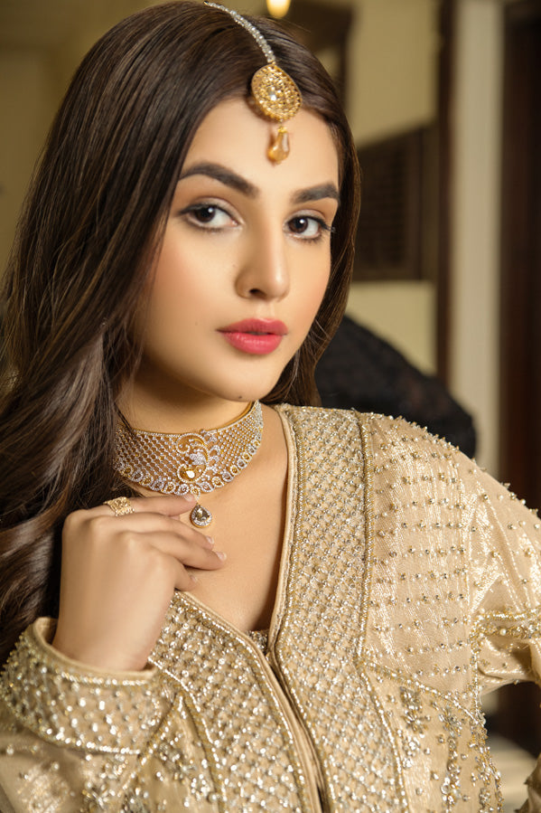 Short length front open jacket in beige, embellished with pearls, crystals, sequins and semi-precious stones including intricate worked inner top, completing the look with plain flared Pants. (Front Open Jacket, Bustier, Flared Pants Included 3 Pcs).