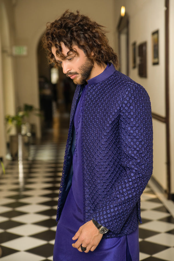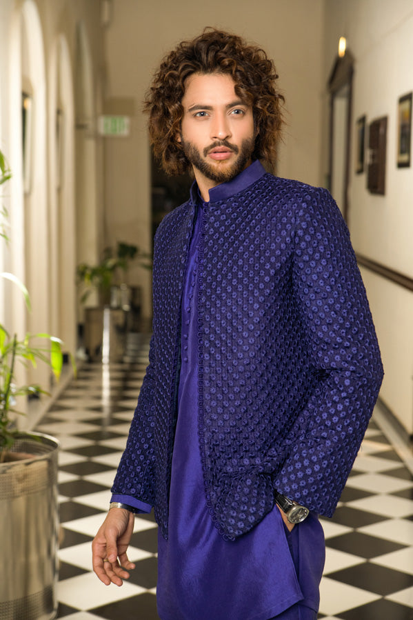 Classic kurta with sleek tone of blue with exquisite, detailed embroidery, front slit open, paired with matching shade plain kurta and pants, perfect choice for a men.